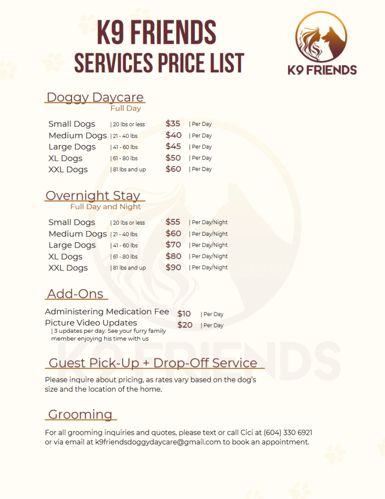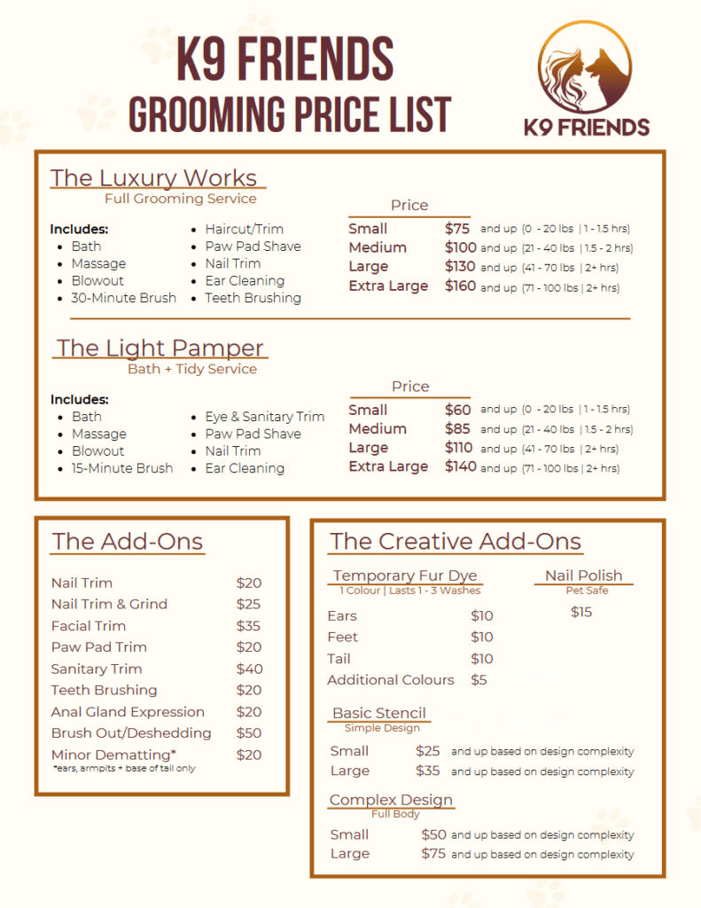 Grooming services at K9 Friends are provided by highly skilled independent contractors we carefully select to ensure exceptional care and consistency for your pet.